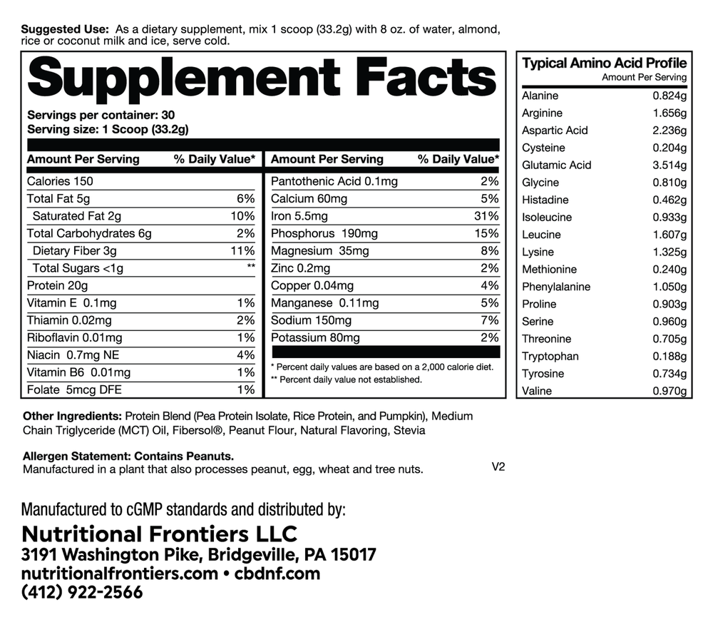 Protein Blend (Pea Protein Isolate, Rice Protein, and Pumpkin), Medium Chain Triglyceride (MCT) Oil Fibersol, Peanut Flour, Natural Flavoring, Stevia