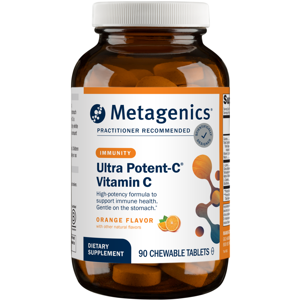 Ultra Potent-C Chewable is an exclusive, patented vitamin C formula in a great tasting natural Orange Blast flavor. In addition to providing support for immune health and antioxidant protection, vitamin C is essential for the production of collagen and connective tissue. One tablet of Ultra Potent-C Chewable provides the same amount of vitamin C found in four oranges.
