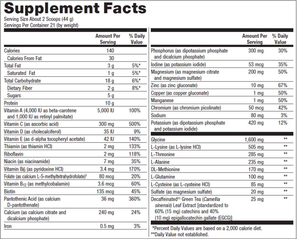 UltraClear Plus is formulated to provide enhanced, specialized support for balanced metabolic detoxification, including macro- and micronutrients to address liver function. This formula features glycine and L-cysteine to help support Phase II liver detoxification. Green tea catechins and beta-carotene provide protection against potentially harmful compounds generated during the natural liver detoxification process. Provided in a base of 13 g OptiProtein (10 g of intact rice protein plus 3 g of added amino acids)—which may benefit liver function during metabolic detoxification—this formula provides well-rounded nutritional support.