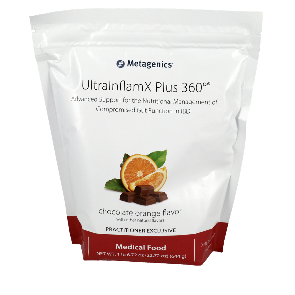 UltraInflamX Plus 360° is a medical food formulated to provide strategic macro- and micronutrient support for patients with compromised gut function resulting from inflammatory bowel disease, including ulcerative colitis and Crohn's disease. Provided in a proprietary, vegan pea/rice protein base, this formula addresses increased nutrient needs and potential deficiencies in these patients. This formula features CurQfen, a clinically studied, patented curcumin blend designed for greater bioavailability and more reliable clinical outcomes. It has been demonstrated to result in up to 45.5 times more free curcuminoids in human plasma compared to standard curcumin extract. UltraInflamX Plus 360° also features XNT ProMatrix–a proprietary protein matrix technology designed to enhance the delivery of a high quality xanthohumol compound for increased bioavailability and stability.