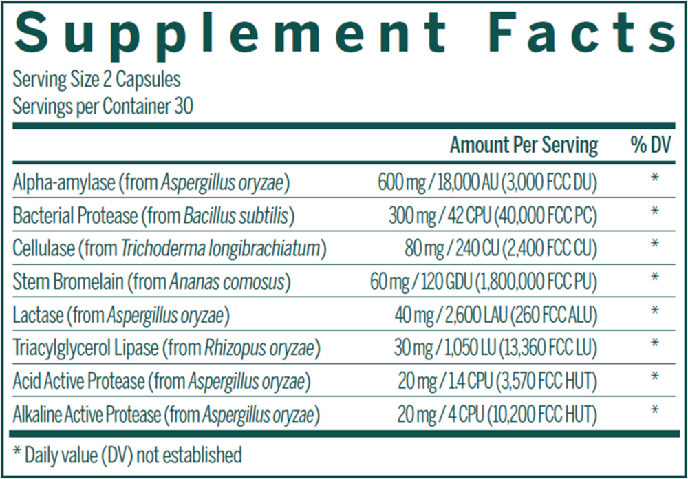 Includes lactase, which helps in lactose digestion as per in vitro laboratory results