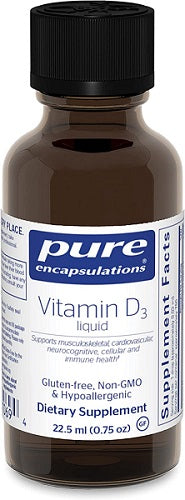 Pure Encapsulations Vitamin D3 liquid provides 25 mcg (1,000 IU) per drop. For individuals with greater short-term needs, this product allows for achieving 625-1,250 mcg (25,000-50,000 IU) vitamin D3 per week without having to take multiple capsules. For the elderly, Vitamin D3 liquid is an easy-to-use form. Vitamin D3 is offered in a base of medium chain triglycerides to support absorption. Vitamin D3 liquid is also free of preservatives, artificial colors, flavors and sugars.