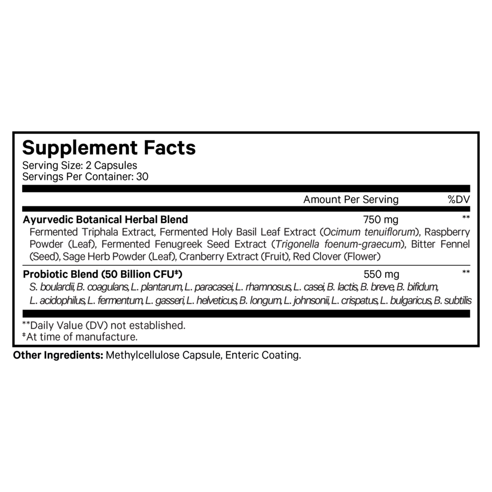 Fermented Triphala Extract, Fermented Holy Basil Leaf Extract (Ocimum tenuiflorum), Raspberry Powder (Leaf), Fermented Fenugreek Seed Extract (Trigonella foenum-graecum), Bitter Fennel (Seed), Sage Herb Powder (Leaf), Cranberry Extract (Fruit), Red Clover (Flower)