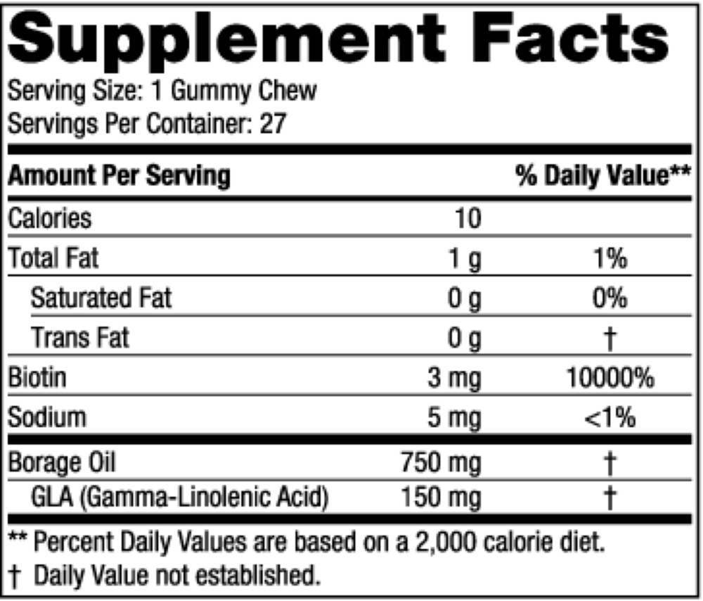 $26.99Hair & Skin Gummy Chews combine essential vitamin B7 (biotin) with highly concentrated gamma-linoleic acid (GLA) from borage seed oil to provide research-backed support for healthy skin and hair.